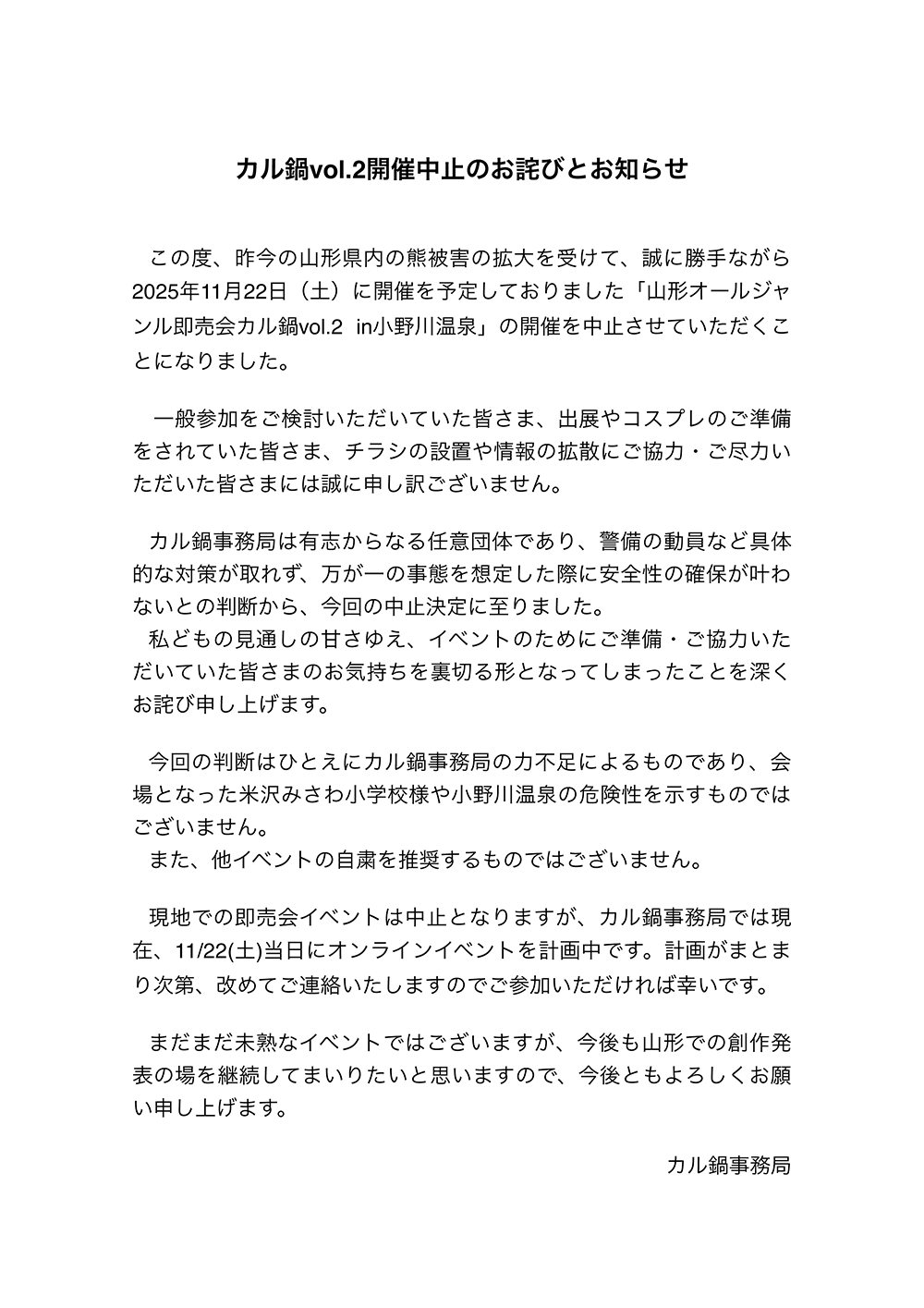 【山形オールジャンル即売会カル鍋vol.2 in小野川温泉】開催中止のお知らせ